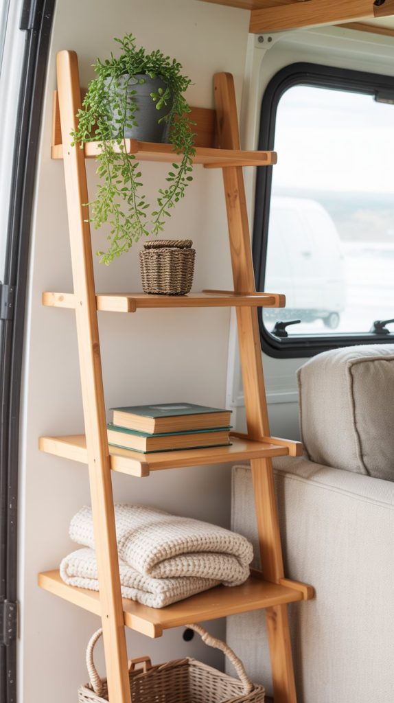 Utilizing vertical space is a game-changer in small living quarters. This image focuses on a narrow, freestanding ladder shelf tucked into a corner beside the sofa. Made of light pine or painted white, its open shelves display a curated mix of items: a folded throw blanket, a stack of books, a small basket holding remotes, and a trailing pothos plant. The open design keeps the area from feeling closed in.