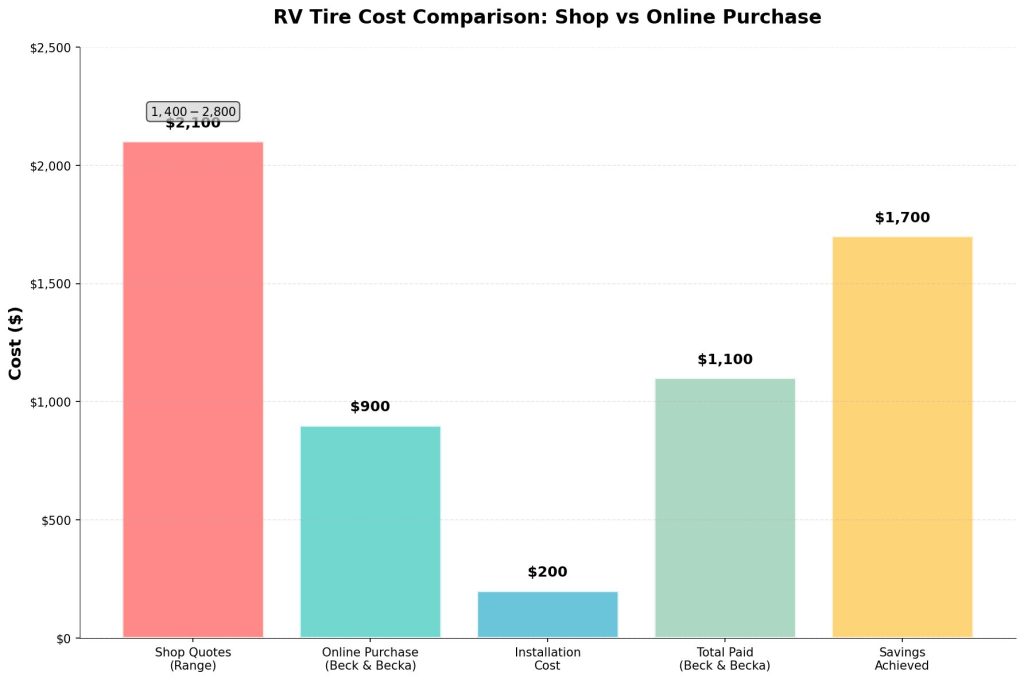 The biggest game-changer in Beck and Becka’s strategy was buying their tires online instead of through a traditional RV shop. They found all six tires for just $900 online, compared to shop quotes that ranged from $1,400 to $2,800 for the same job.