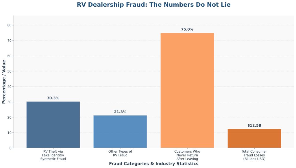 Before we dive into specific scams, let’s look at the shocking statistics. According to recent industry surveys, a staggering 30.3% of RV dealers reported having an RV stolen due to fake identity or synthetic fraud in the past 12 months alone. An additional 21.3% of dealers experienced other types of fraud, meaning over half of all RV dealerships are dealing with fraudulent activities.
