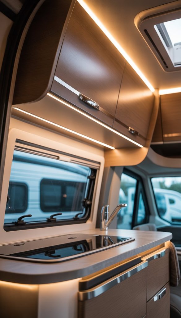 Adding LED strip lighting under your cabinets can brighten up your RV’s kitchen and living space. It helps you see better when cooking or working on small tasks. The lights also create a cozy vibe without using much power.