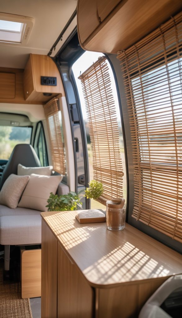 Choose bamboo blinds with a simple pulley system. This makes them easy to open and close when you are driving or parked. Also, pick a color that matches your RV’s interior to keep the style neat and cozy.