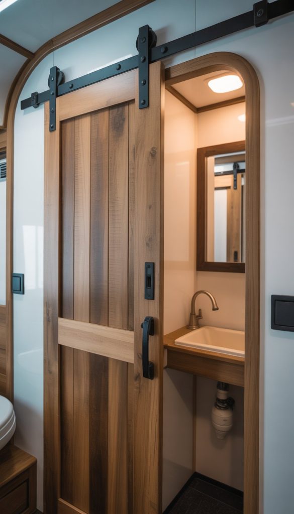 Using a sliding barn door in your RV bathroom saves space. Traditional doors need room to swing open, but sliding doors slide along the wall. This helps make tight spaces feel less cramped.