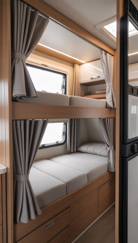Building a bunk bed in your RV saves space and adds sleeping spots. You can make it cozy by adding curtains to each bunk. These curtains give you privacy, which is helpful if you travel with family or friends.