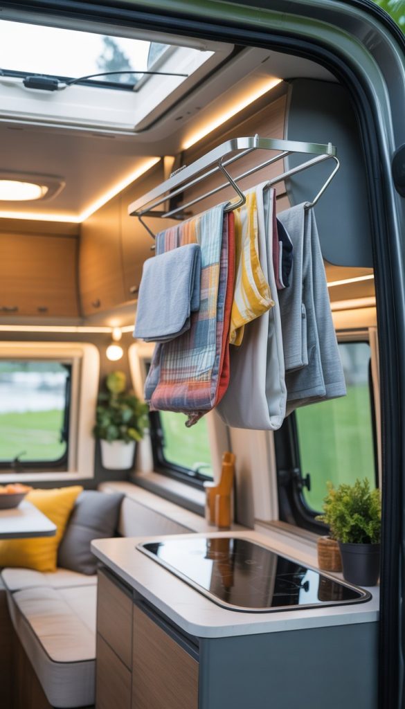 A ceiling-mounted drying rack is a smart way to save space inside your RV. You can hang clothes, towels, or even swimwear to dry without using up your limited floor area.