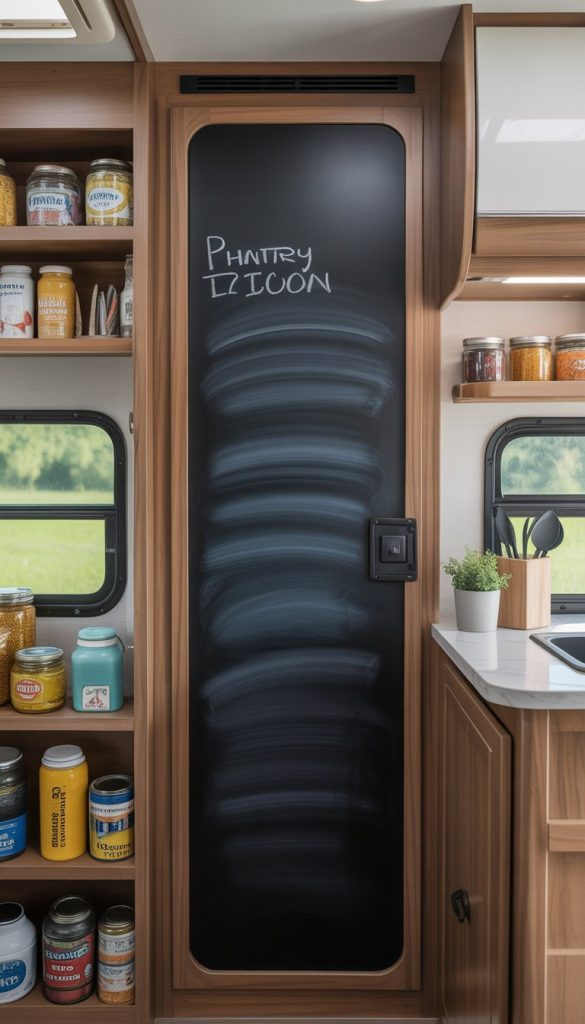 Using chalkboard paint on your pantry door is a simple way to add style and function to your RV. It turns the door into a place to write shopping lists or meal plans. You can also doodle on it during downtime.