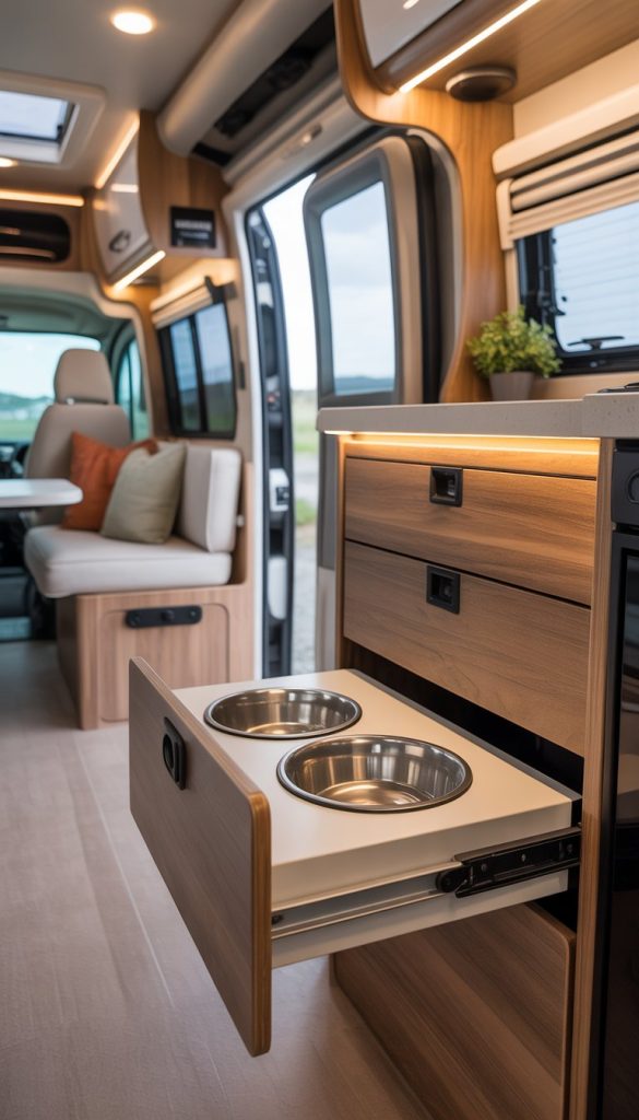 A fold-away pet feeding station saves space in your RV. It keeps your pet’s bowls organized and off the floor. When not in use, you simply fold it back against the wall.