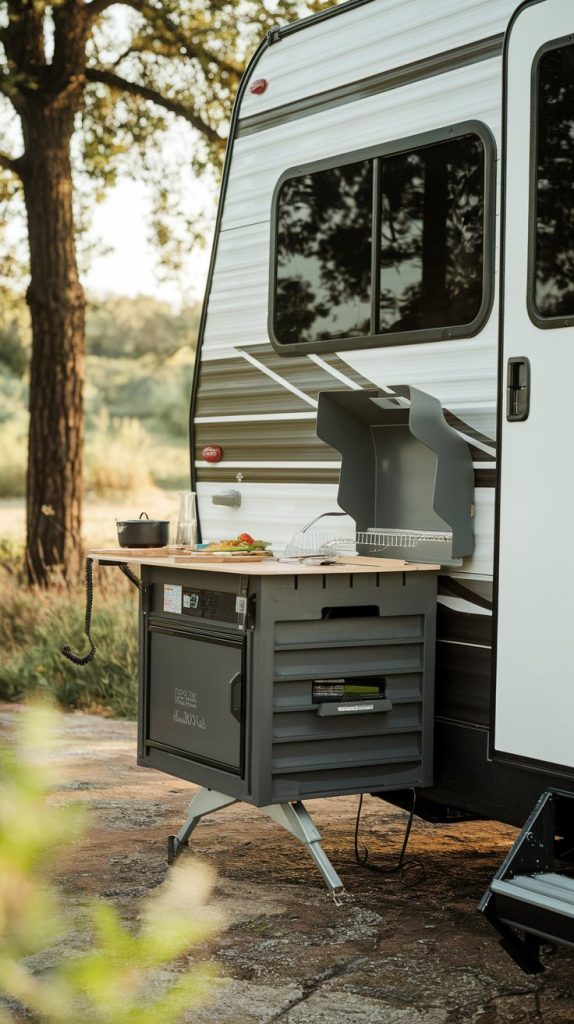 Adding a fold-out outdoor kitchen station to your RV can make cooking outside easy and fun. This setup usually includes a small countertop, a grill or stove, and some storage space. You can prepare meals without going inside the RV, which keeps things cool and clean indoors.