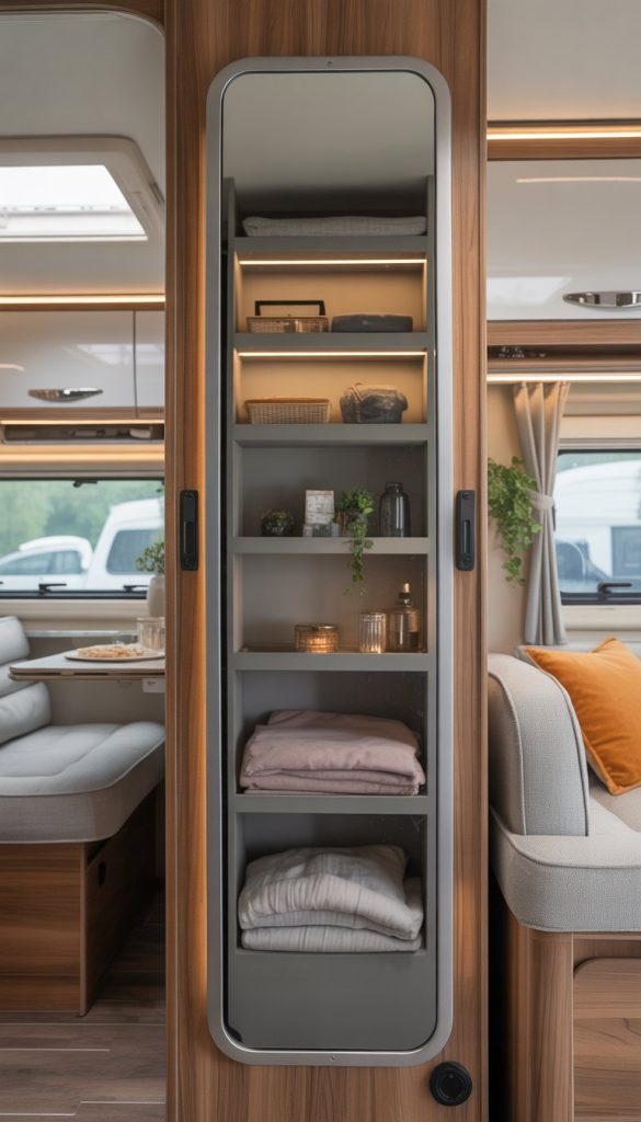 A full-length mirror can make your RV feel bigger and brighter. It also gives you a place to check your outfit before heading out.