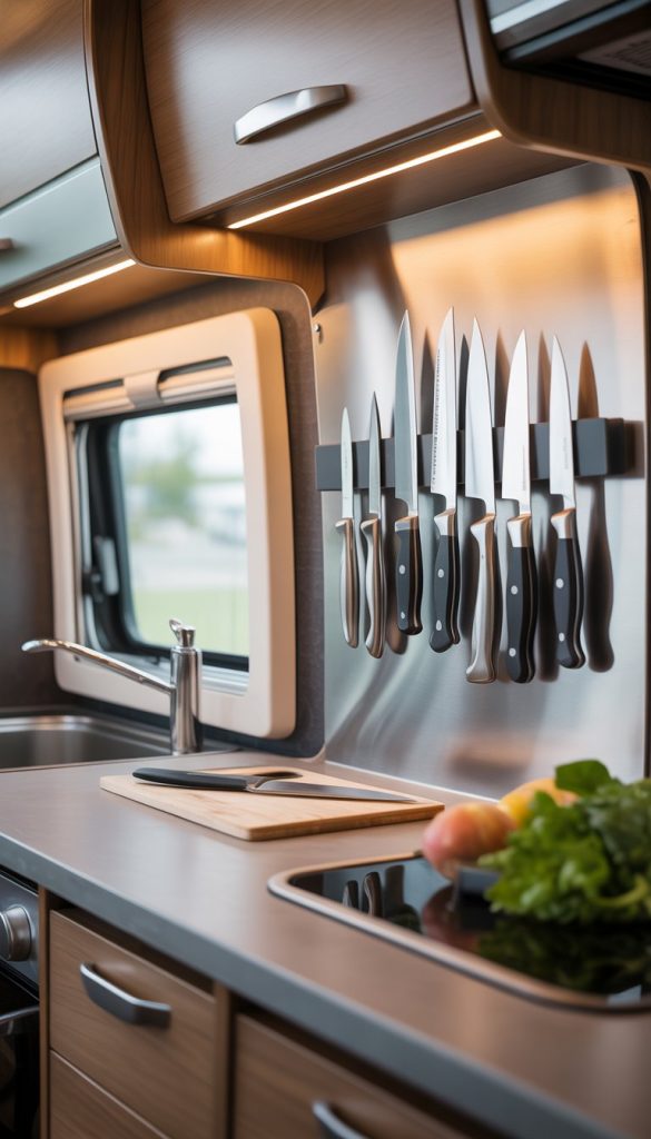 Magnetic knife strips are a handy way to keep your knives easy to reach. You can mount them on the wall, so your counters stay clear for cooking or other tasks. This is great for small RV kitchens where space is tight.