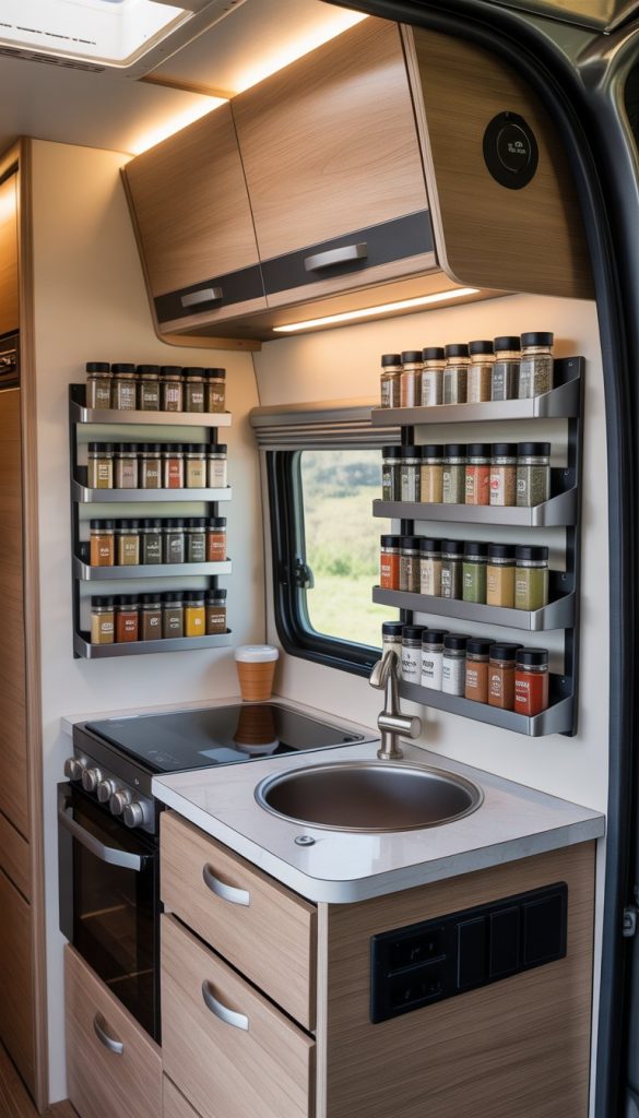 Magnetic spice racks are a smart way to save space in your RV kitchen. You can stick jars right onto the wall, keeping spices within easy reach while cooking.