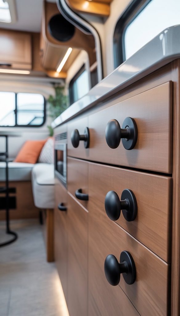 Changing your cabinet knobs to matte black is a simple way to refresh your RV’s look. Matte black adds a modern touch without being too flashy. It works well with many colors and styles.