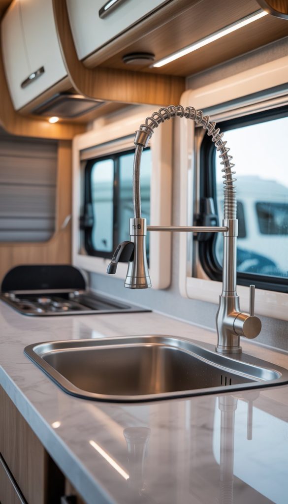 Upgrading your RV kitchen faucet to a pull-down sprayer model can make washing dishes much easier. It gives you more reach and control, helping you rinse pots and pans more quickly. These faucets often look more modern, too.