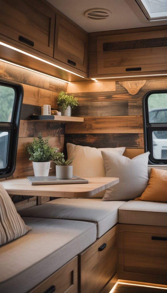 Adding reclaimed wood to your RV walls can give your space a cozy, rustic feel. It brings character and warmth without needing much work.