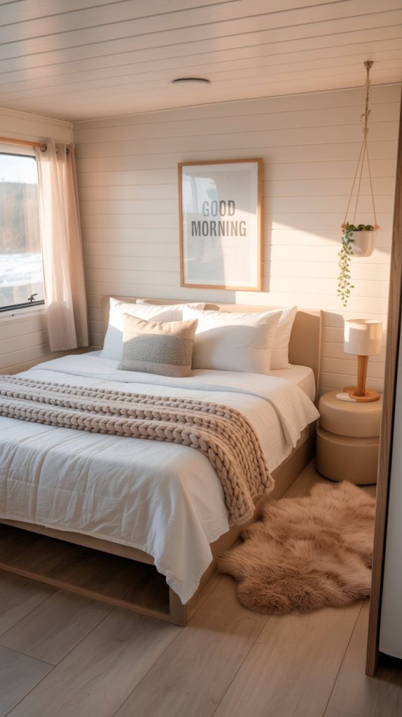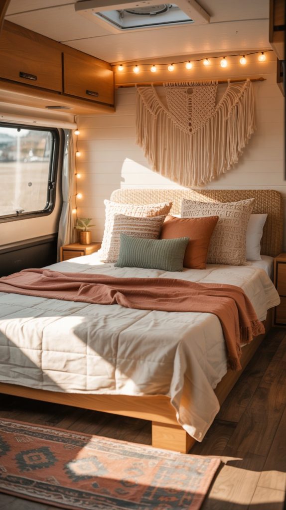 Turn your RV bedroom into a boho paradise with layered textiles, macramé wall hangings, and plenty of throw pillows in earthy tones. A rattan headboard or woven wall art adds texture, while fairy lights create a dreamy ambiance.