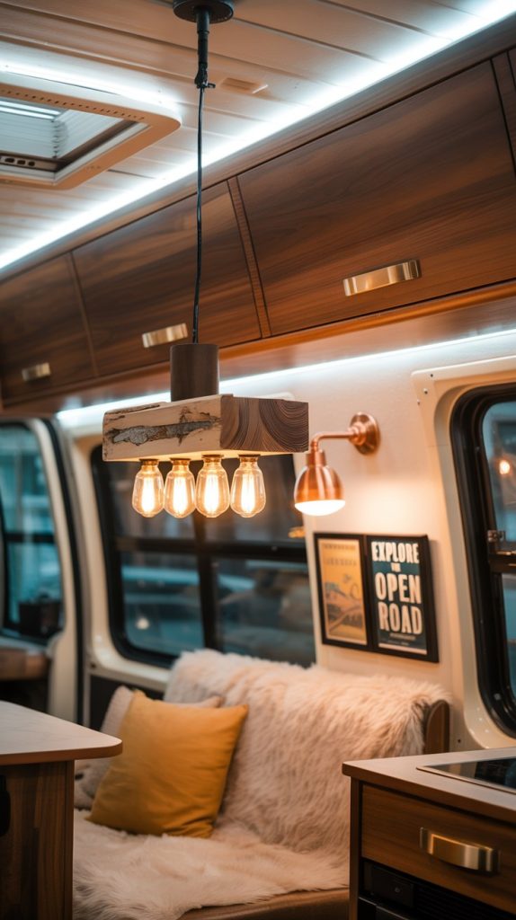 Swap outdated RV lighting for Edison bulbs, pendant lights, or sleek LED strips. Industrial-style cage fixtures or copper pipe sconces add character without overwhelming small spaces.