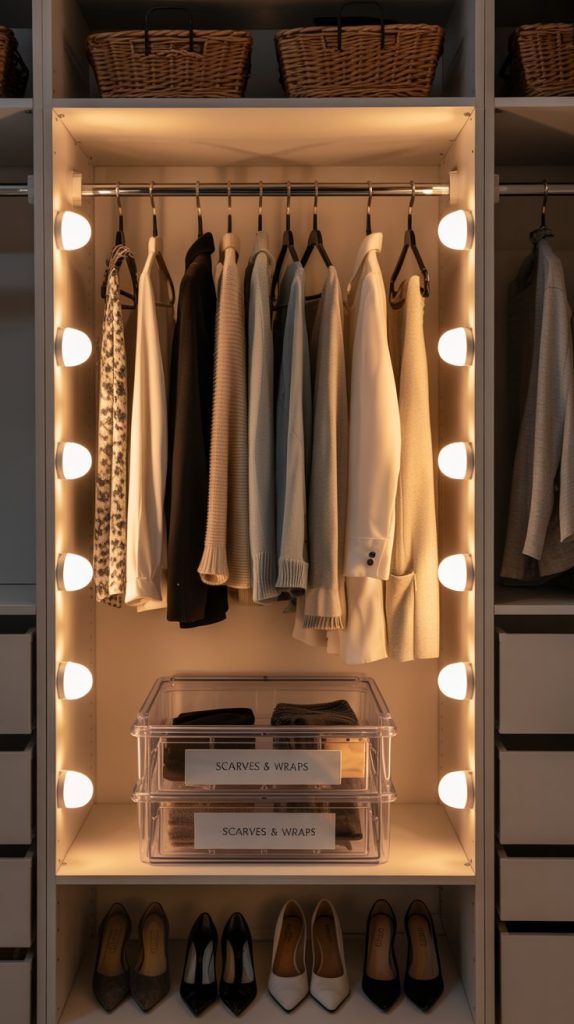 Use the back of the closet door for added storage—a hanging shoe organizer holds far more than just shoes, perfect for rolled belts, scarves, or small accessories. Clear stackable bins on the top shelf keep seasonal items visible but out of the way, while under-shelf baskets create extra layers for folded sweaters or bags. For dark corners, battery-operated motion-sensor LED lights automatically illuminate when you open the door.