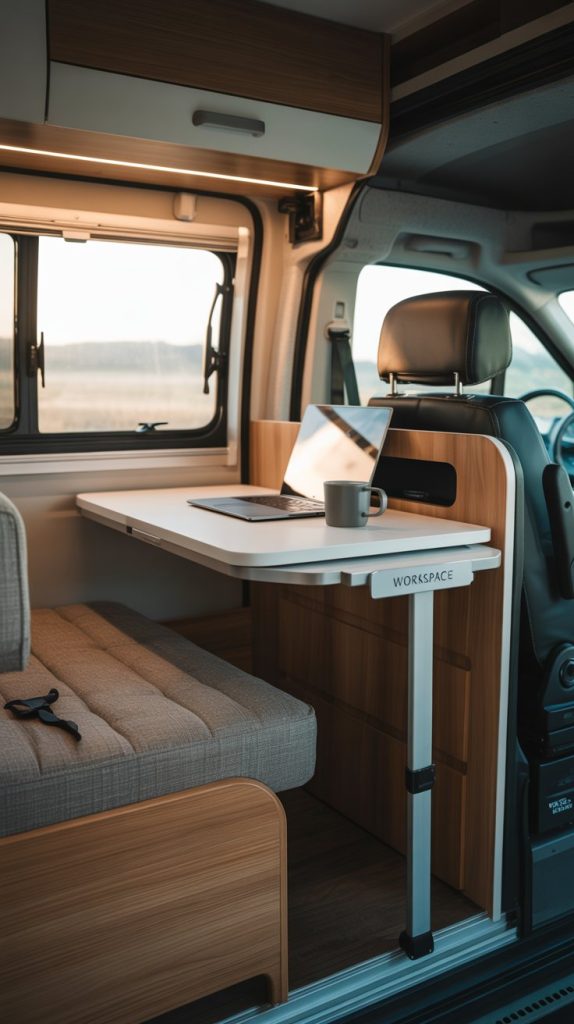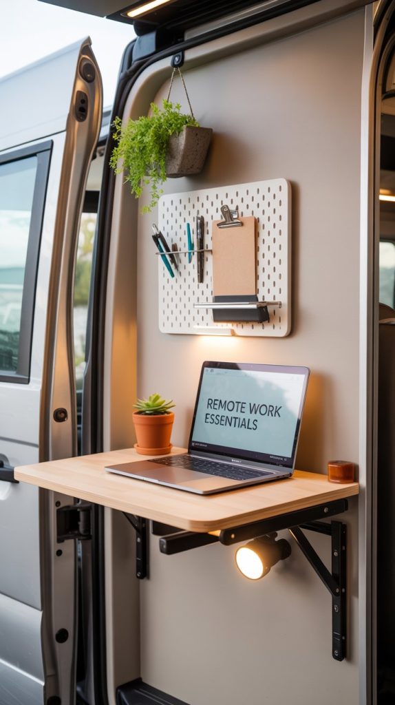 For remote workers, carve out a dedicated workspace with a fold-down desk or a compact lap desk that stows away in your RV. Install a small pegboard above the desk to organize supplies, or use a suction-cup organizer on the window.