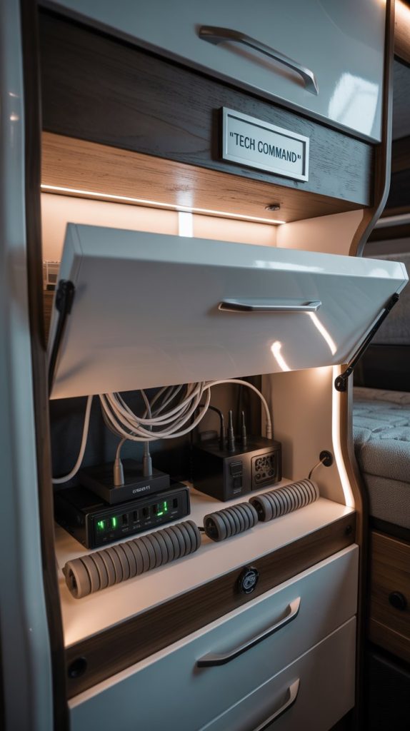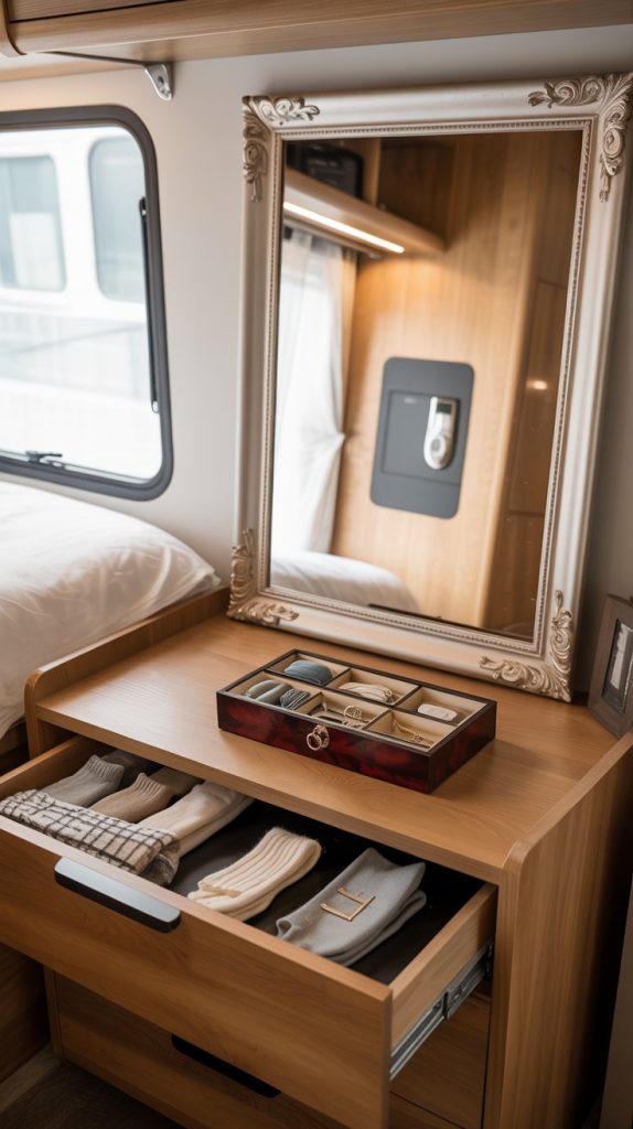 Keep your valuables secure and organized with these clever hidden storage ideas for your RV. A false-bottom drawer in your bedroom dresser provides discreet space for jewelry boxes, with the top layer appearing to hold everyday items like socks or accessories. For smaller pieces, install a narrow wall-mounted safe behind a framed mirror or artwork—opt for biometric locks for quick, keyless access.