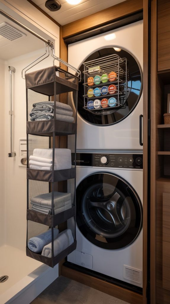 Store detergent pods in a magnetic spice rack on the washer lid, and fold dirty clothes into a hanging mesh hamper that compresses flat.