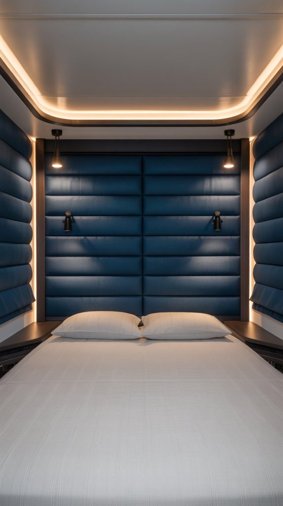 Elevate your bedroom with a padded headboard wall upholstered in marine-grade fabric, dimmable LED cove lighting, and blackout curtains with hidden magnets for perfect seals.