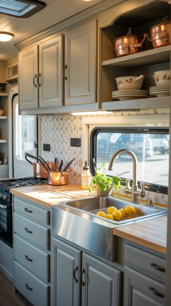 Give your RV kitchen a cozy yet modern farmhouse feel with shaker-style cabinets, open shelving, and a fresh coat of white or light gray paint. Swap out outdated hardware for matte black or brass handles to elevate the look. A peel-and-stick backsplash adds charm without the weight of traditional tile.