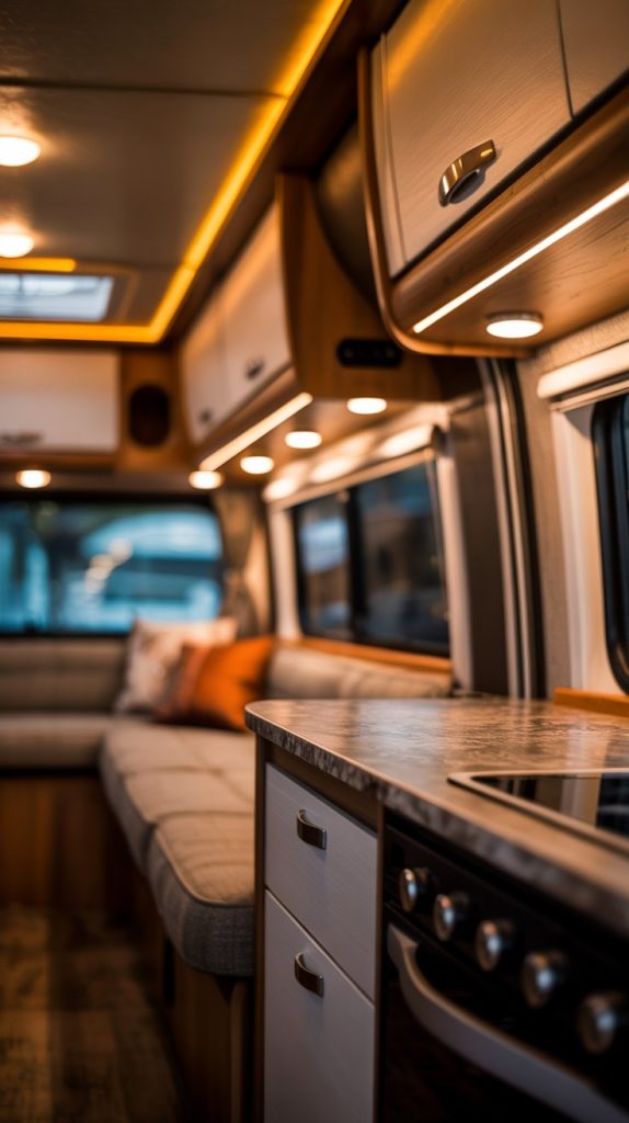 Transform your RV’s ambiance by layering different lighting types throughout the space. Start with warm white puck lights under cabinets for subtle task lighting, then add color-changing LED strips along ceiling edges to set different moods – energizing blues for morning routines or calming amber for evenings.