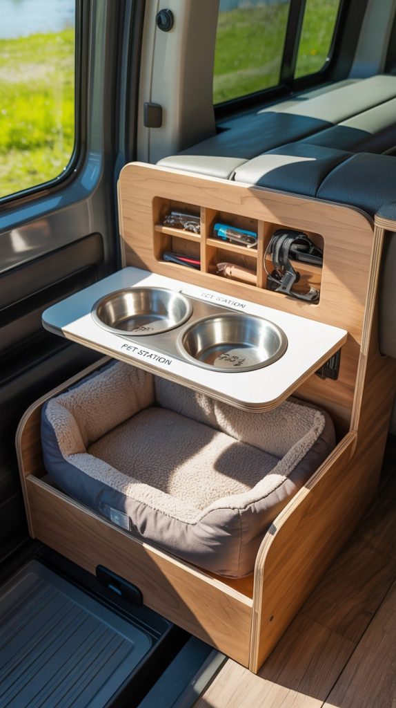 Create a dedicated pet nook with a fold-out food/water bowl station and built-in storage for leashes and toys. Use a removable pet bed that tucks under seating when not in use.