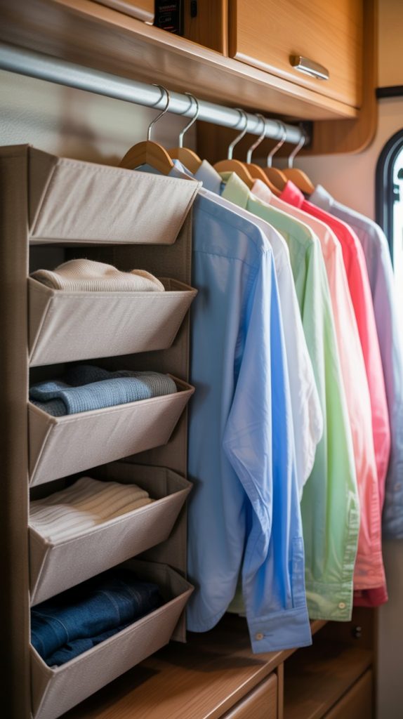 Tiny closets don’t have to mean chaos—transform your RV storage with these space-maximizing solutions. Start by installing a double-hang rod system to effectively double your hanging space, using the lower rod for pants, skirts, or folded items in fabric bins. Slim velvet hangers prevent slipping while saving precious inches between garments.