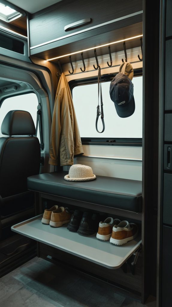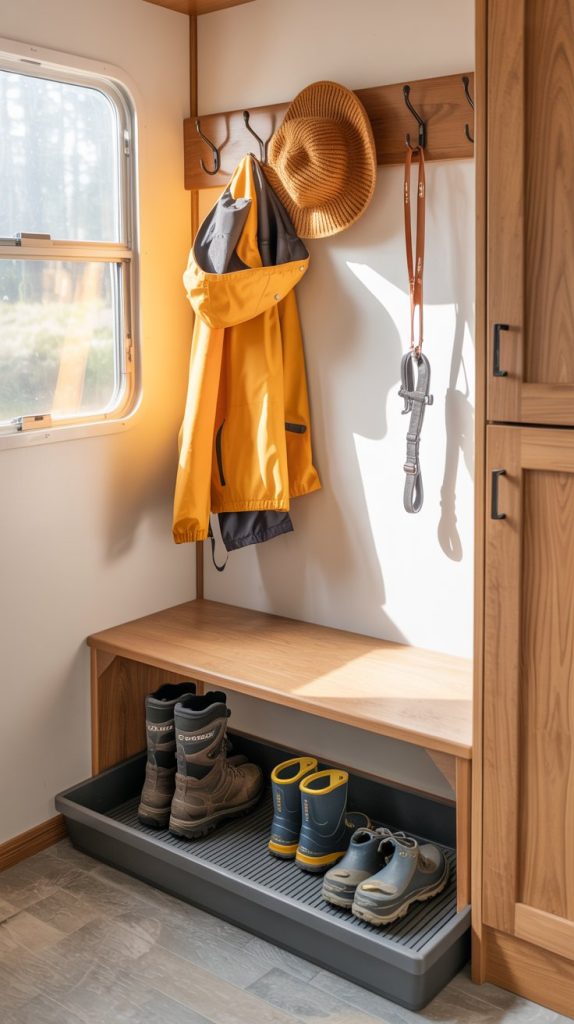 Create an organized transition zone at your RV’s entrance with clever storage solutions. Begin with a shallow boot tray that slides completely under a nearby seat when not in use, keeping dirt contained but out of sight. Install sturdy hooks at varying heights for jackets, hats, and leashes, positioning them near a flip-down bench that reveals hidden shoe storage underneath.