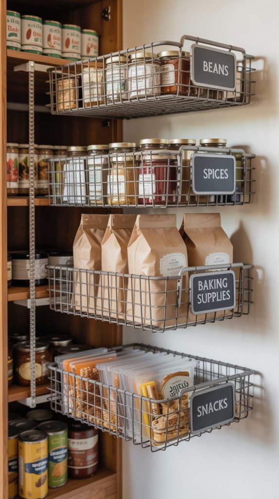 Install pull-out wire baskets or clear acrylic bins in deep cabinets. Use tension rods to create vertical divisions for canned goods, and label everything with a chalkboard sticker system.