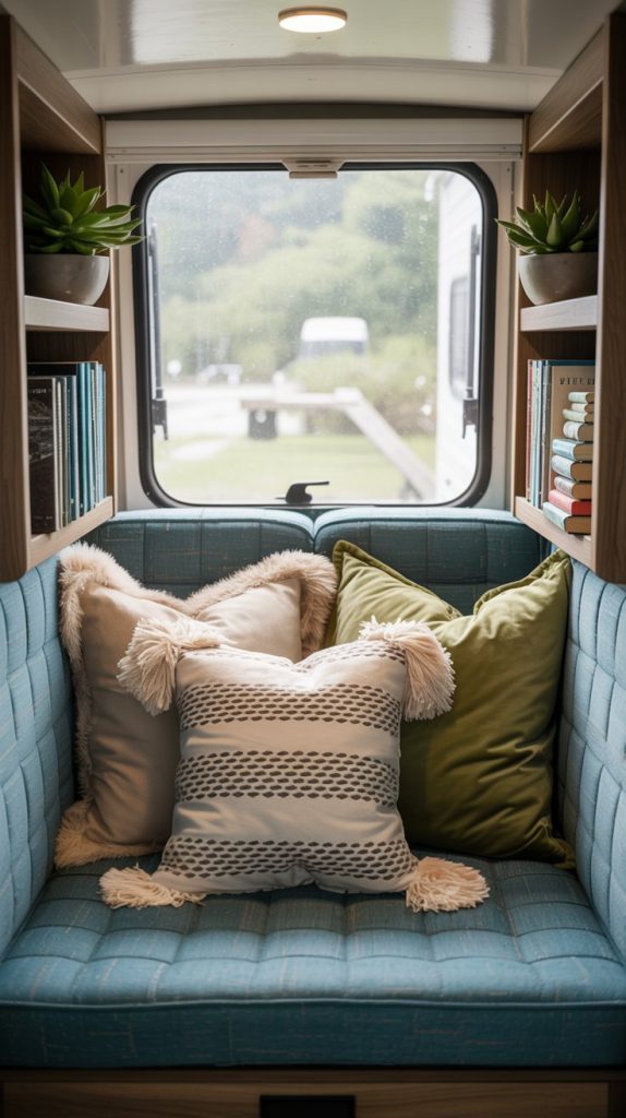 Transform an underused window area in your RV into a cozy reading nook with a cushioned bench and built-in storage underneath. Use outdoor-rated fabric for durability, and add throw pillows for comfort.