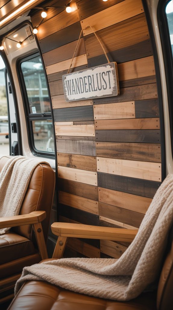 A reclaimed wood or faux wood peel-and-stick accent wall adds warmth and character to your RV living area. This inexpensive upgrade instantly makes the space feel cozier and hides minor wall imperfections. Pair it with leather or linen upholstery for a cabin-like vibe.