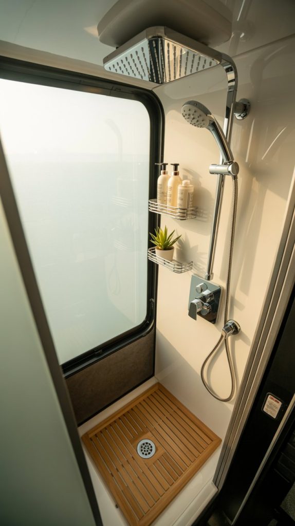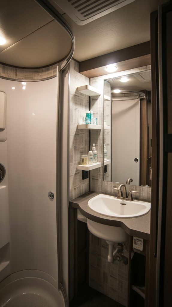 Replace bulky vanities with floating shelves for toiletries and opt for a mirrored cabinet to create the illusion of more space. A rainfall showerhead (if your water system allows) can make your RV shower feel like a spa.