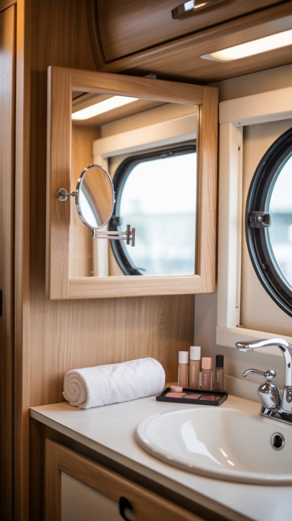 Carve out a glamorous prep area in even the most compact RV bathroom with these transformative ideas. Convert a shallow upper cabinet into a dedicated beauty station by mounting a stick-on magnification mirror on the inside of the door – when closed, it disappears completely.