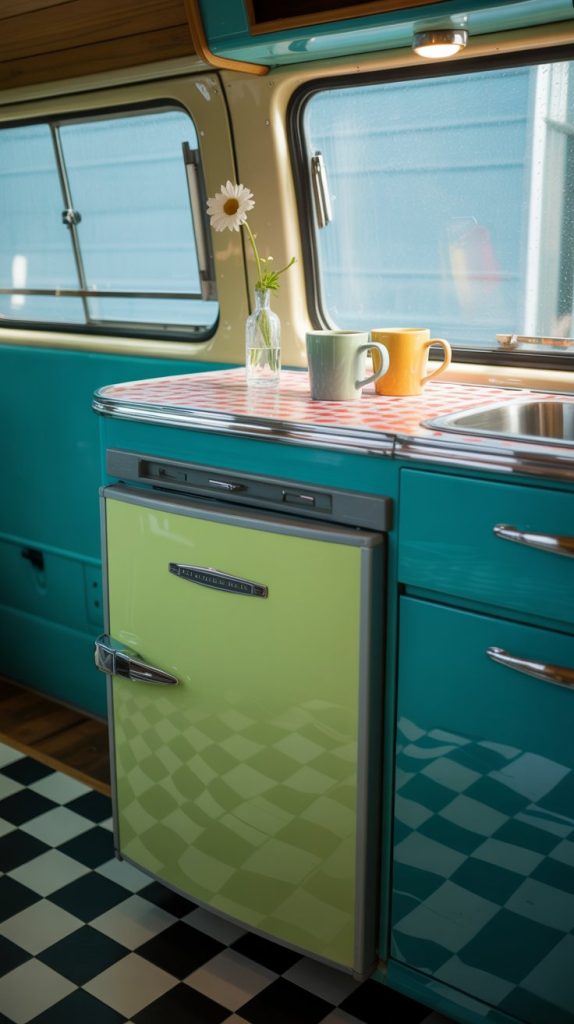 Embrace retro vibes with pastel colors, checkerboard flooring, and chrome accents. Hunt for vintage-inspired appliances or use contact paper to mimic an old-school fridge.