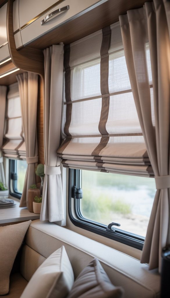 Using both curtains and Roman shades in your RV gives you more control over light and privacy. You can keep the shades down for full coverage and pull back the curtains to add a decorative touch.