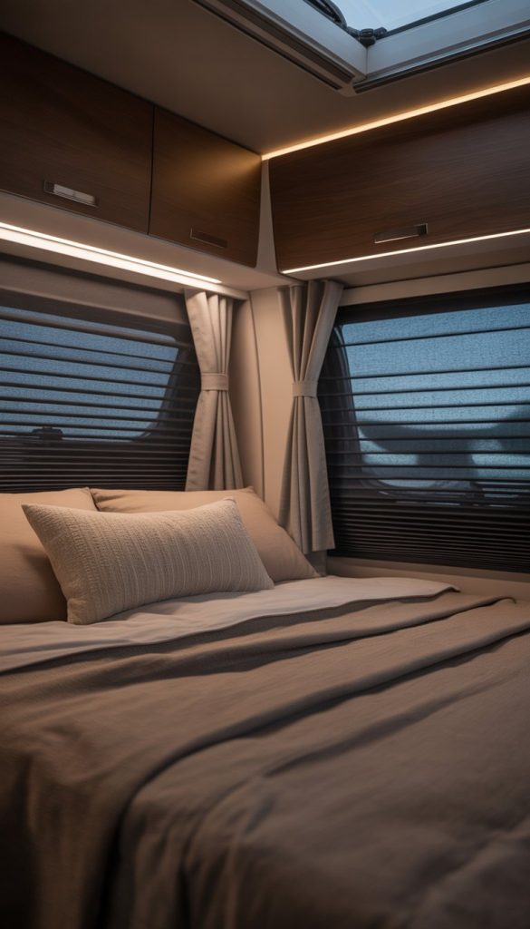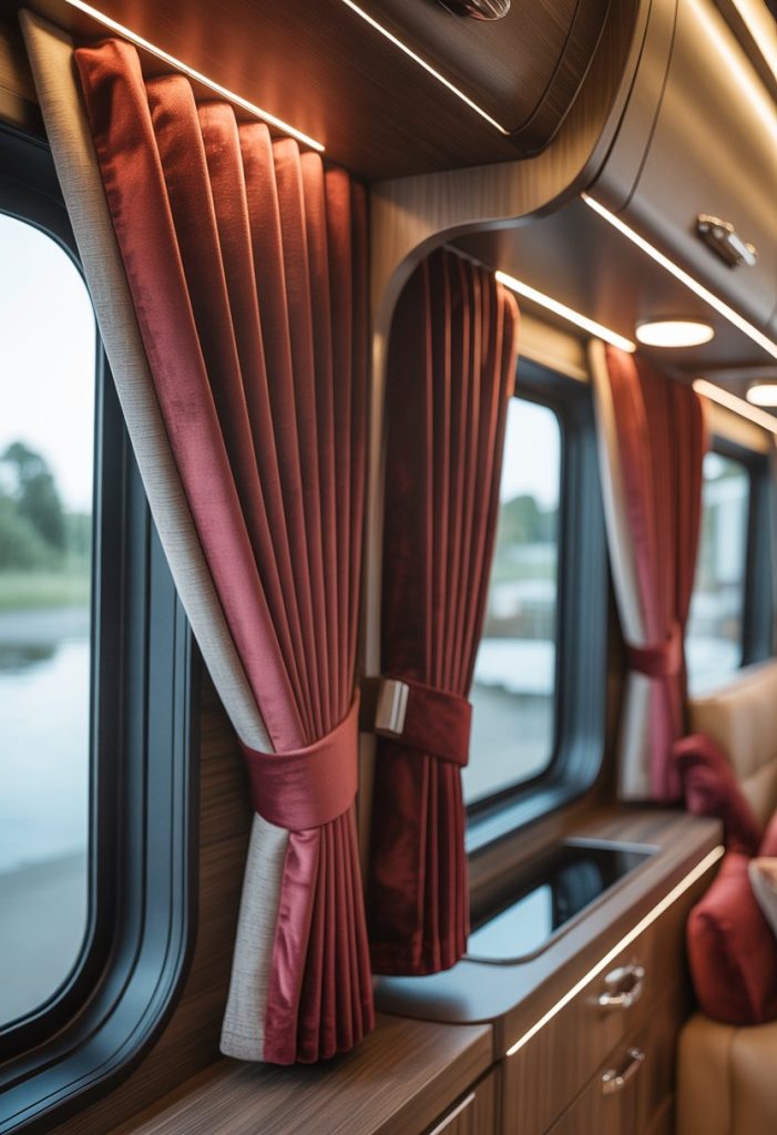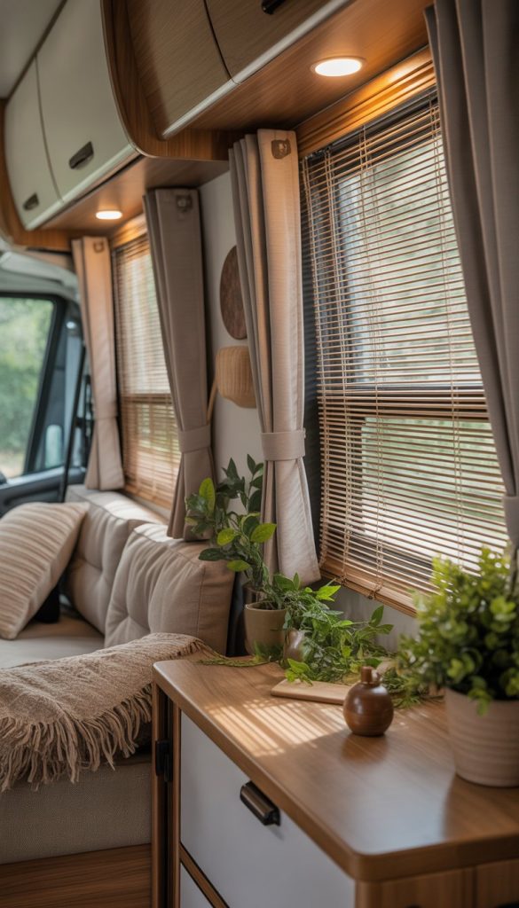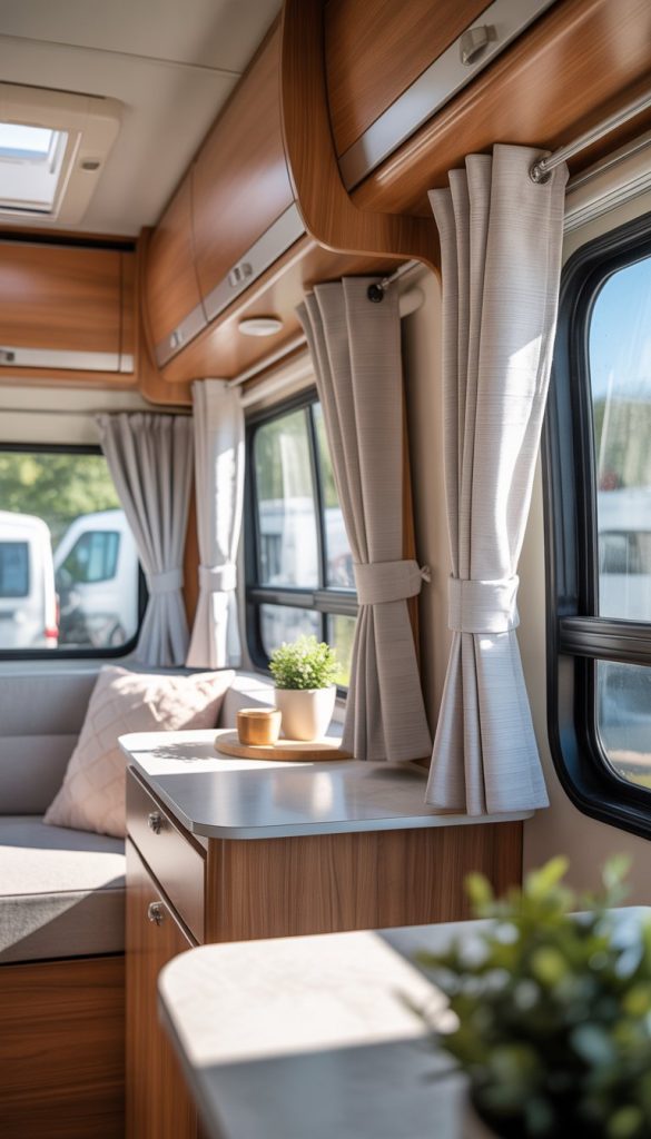 Choose lightweight curtains to avoid adding bulk. Pick a pattern or color that matches your RV’s interior for a cozy feel. This way, your window treatments blend in and make your space feel bigger.