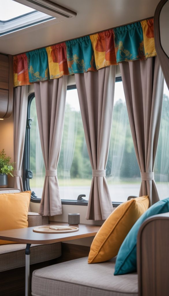 Using colorful valances over plain curtains can add a fresh look to your RV windows. You can pick valances with bright patterns or bold colors to brighten the space. This mix and match style gives your RV a fun and cozy feel.