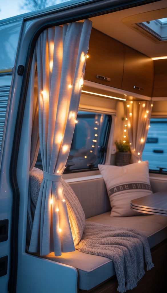 Placing fairy lights behind your RV curtains can make the space feel warm and inviting. The soft glow adds a gentle light that’s perfect for relaxing evenings.