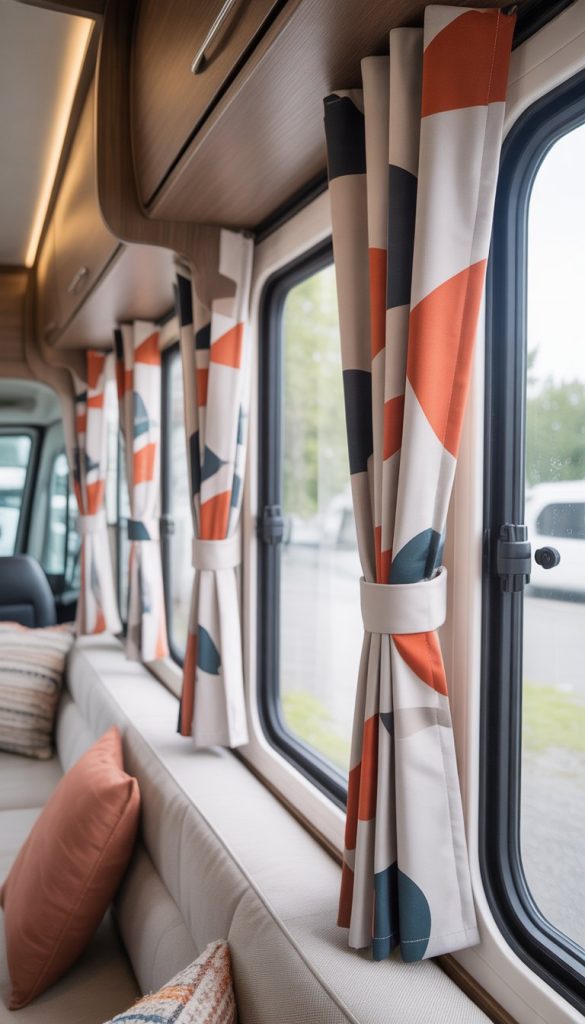 Choosing curtains with geometric patterns is a simple way to make your RV feel fresh and modern. These patterns add shape and interest without being too loud. You can find designs like triangles, squares, or circles that make your space look stylish.