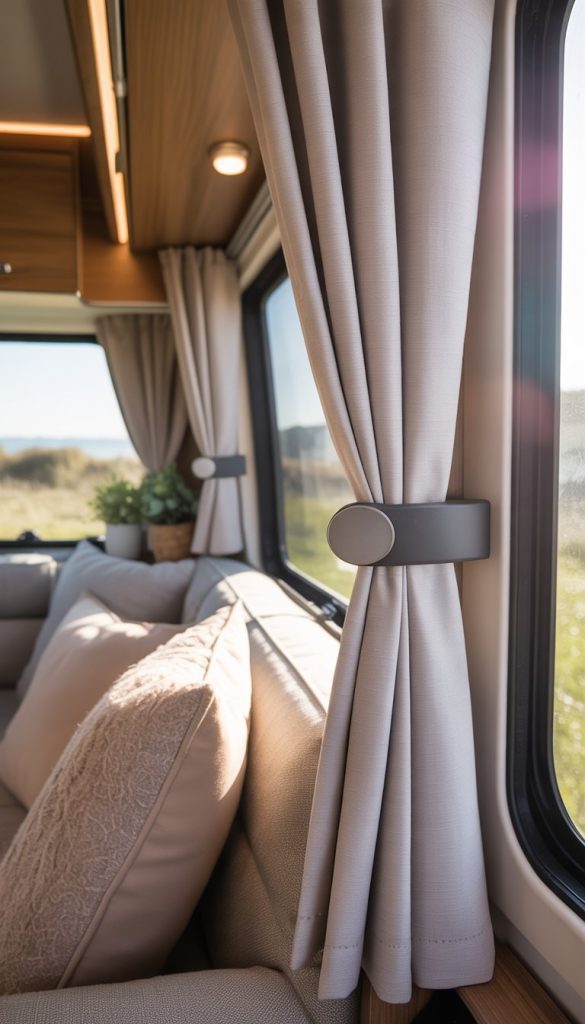 Magnetic curtain tiebacks are a simple way to keep your curtains open. You can move them easily to let in more light or close your curtains fast. They don’t need hooks or nails, so your RV walls stay safe.