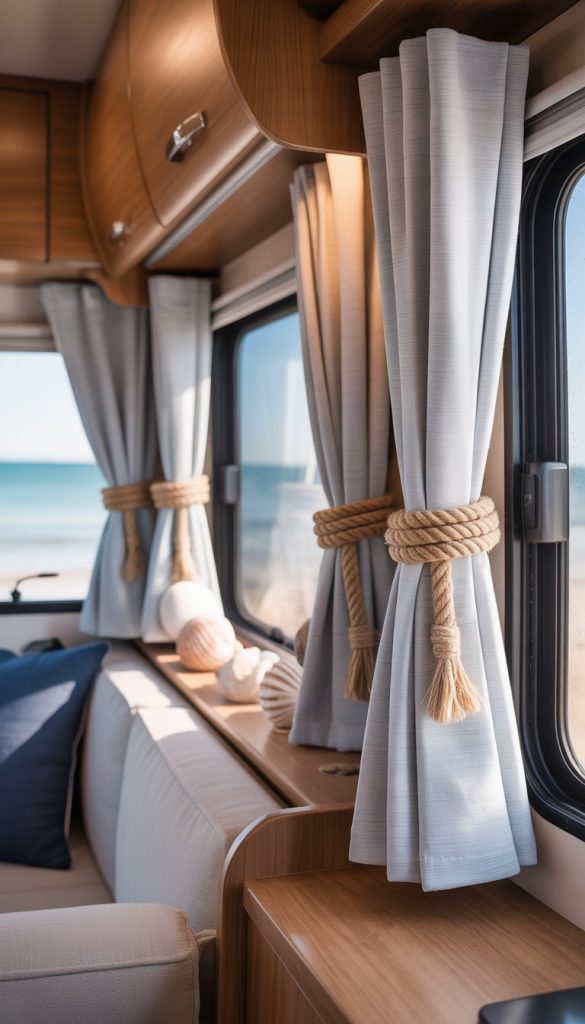 3) Use tiebacks with nautical rope for an RV beach vibe