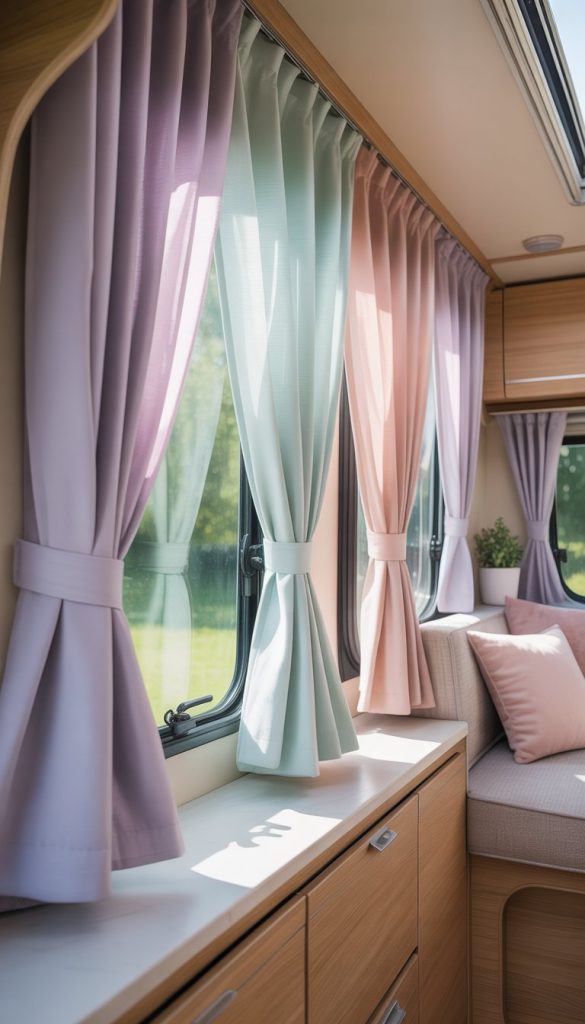 Choose light colors for your curtains to make the space feel open and airy. Thin fabrics like linen or cotton work well. They give you privacy while letting enough light through to brighten your RV.