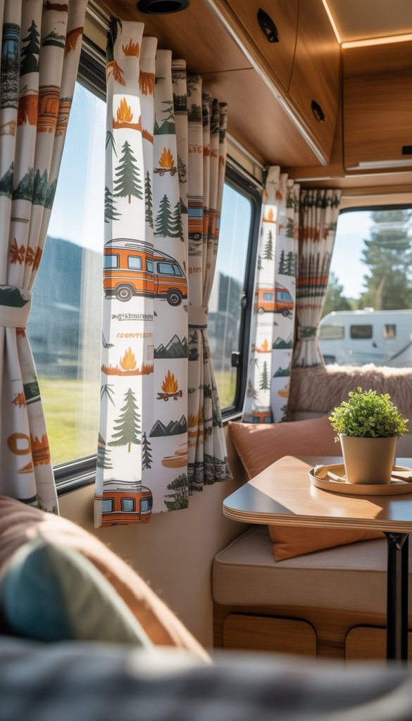 Adding curtains with RV-themed prints can give your space a playful and personal feel. You might find patterns with little campers, mountains, pine trees, or camping gear. These prints can bring a fun vibe without being too loud.