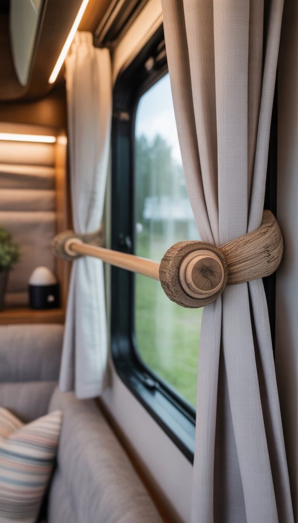 Adding rustic wooden finials to your curtain rods can give your RV a warm, cozy feel. They bring a natural touch that fits well with wood and metal elements often found in RVs.