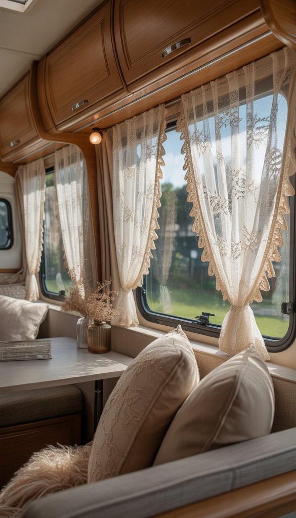 Lace curtains also make your space feel cozy and light. They work well with wood or neutral tones, giving your RV a warm and inviting vibe. Plus, they don’t take up much space, perfect for smaller windows.