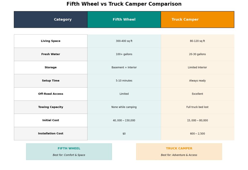 Space Statistics: The average truck camper offers 80-120 square feet of living space, compared to 300-400 square feet in a typical fifth wheel.