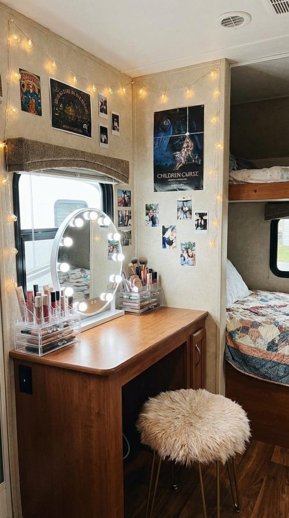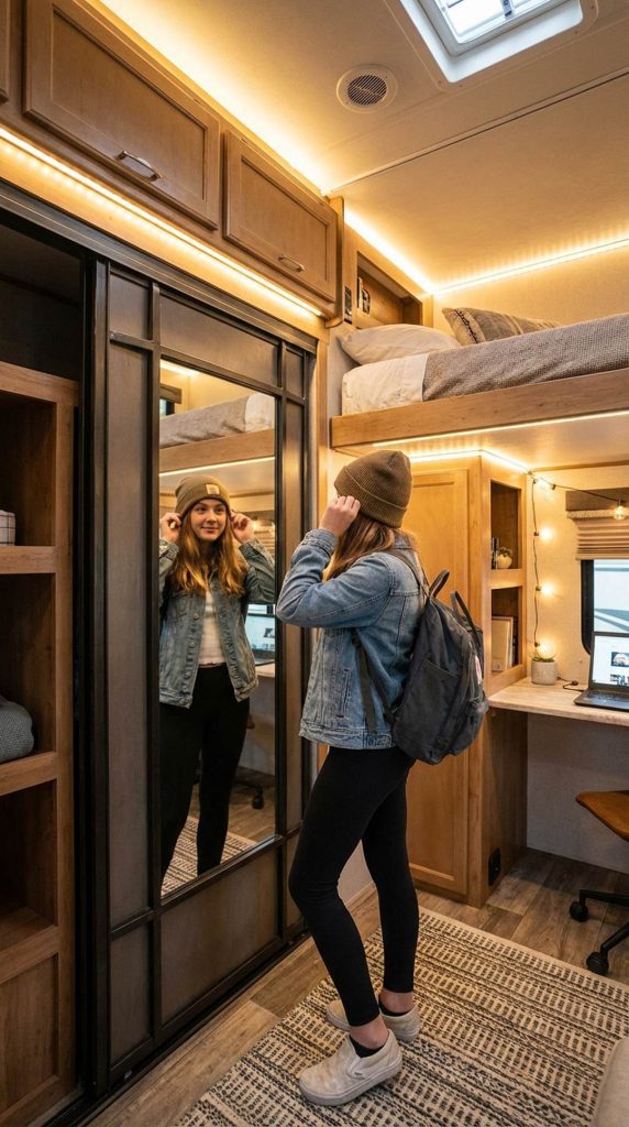 A full-length mirror is essential for image-conscious teens who want to check their appearance before heading out. In an RV where space is limited, an over-the-door or wall-mounted mirror provides this functionality without taking up floor space. Good lighting near the mirror is crucial—consider installing battery-operated LED lights around the mirror frame for clear, even illumination.