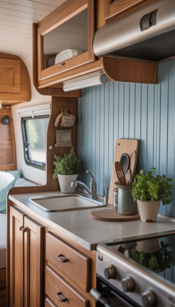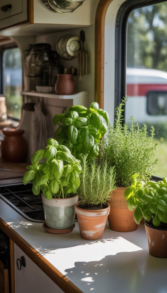 Planting fresh herbs on your RV kitchen windowsill adds a touch of nature and practicality. You can easily snip some basil, parsley, or thyme while cooking. It makes your space feel cozy and alive.