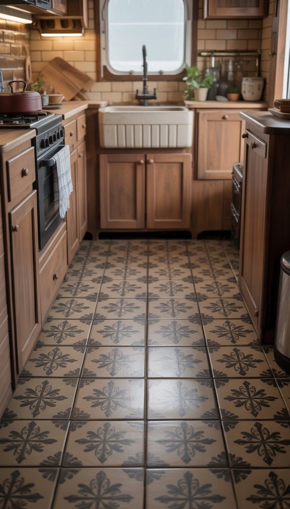 Ceramic tile flooring with faded patterns adds a soft, vintage look to your RV kitchen. It creates a warm, lived-in feel without being too bright or busy. The faded designs bring a touch of French country charm.